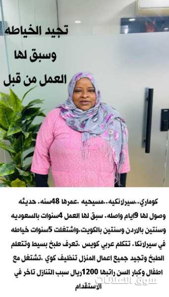 يوجد عامله سيريلانكا خياطه ممتازه سبق لها العمل بالرياض والاردن والكويت تجيد كافه اعمال المنزل من تنظيف وكي الملابس ومحبه للاطفال وتراعي كبار السن وزوي الاحتياجات الخاصه